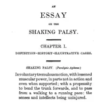 In 1817, James Parkinson published his essay reporting six cases of what he called paralysis agitans.[2] An Essay on the Shaking Palsy described the characteristic resting tremor, abnormal posture and gait, paralysis and diminished muscle strength, and the way that the disease progresses over time.[2][7] He also acknowledged the contributions of many of the previously mentioned authors to the understanding of PD.[2] Although the article was later considered the seminal work on the disease, it received little attention over the forty years that followed.[7] Furthermore, the term paralysis agitans was at times applied to any condition with a loss of motor activity accompanied by seizures. Indeed, the term 'paralysis' alone included both motor and sensory deficits.[8] Noting this, William Sanders proposed in 1865 that the term Parkinsons Disease be used for the onset of symptoms in older people; it had been variously designated paralysis agitans festinia, - senilis or parkinsonii.[9]