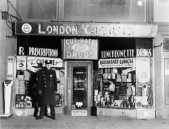 Although the "modern" form of pharmacy was well into its development by the beginning of the 1800s on the east coast and other areas to the west of America, it would take several decades until 1847 before America would finally have control over the furthest south-western continental territories. Although there were several legitimate American doctors in Los Angeles by 1850, none of whom had studied or held degrees in the pharmaceutical sciences, in particular (pharmaceutical formulation) but nonetheless subsequently functioned as "druggist" and as an interesting side note, almost all of whom were not primarily doctors as a main occupation but had other main forms of livelihoods. In ca. 1854 one such case, and also one of the first doctors in L.A., Dr. William B. Osborn (sometimes spelled as Osburn, Osbourne, or Osbourn), also credited as being the first "drug-store" establisher in Los Angeles, had turned his business over (to pursue other non-medical endeavors) to Dr. James P. McFarland and John Gately Downey. The store then under the control of the partnership between McFarland and Downey was then actually run by a Dr. Alexander Hope also a "druggist" as more of an employee of the two men. Downey had previously only apprenticed at an apothecary in Washington, D.C., until 1846 and later worked as an independent "druggist" in Cincinnati, Ohio, before finally arriving in California in 1849. Once in Los Angeles, Downey's main focus and foremost career ambition was mainly that of a politician rather than that of a schooled, professional apothecary or pharmacist. In 1856 Dr. McFarland had also left the business partnership and California to return home to Tennessee. Downey eventually sold the "drug-store" to Dr. Henry M. Myles and C.M. Small (in order to further pursue his true vocation in politics and go on to become the seventh Governor of California from 1860 to 1862) and shortly thereafter Dr. Myles passed away and a German immigrant, pharmacist had taken the business over. It was not until ca. 1860, which saw the first of two European, immigrant, career pharmacists / apothecaries (both of German descent) who arrived in the newly founded American frontier town of Los Angeles, California. The first was the pharmacist Theodore Wollweber (Main St. / Hall at 59)[38] and in 1861 his only competitor at the time, the second pharmacist Adolph Junge,[39] who also established his "drug store" in the same Temple Block (Temple Street) area on 99 Main-St. north of Commercial St. and was in operation for about 20 years thereafter until ca. 1880. The future medical pioneer Dr. Joseph Kurtz (German)[40][41] arrived in L.A. in 1868 at the encouragement and recommendation of close associate Adolph Junge and would go on to be the first Los Angeles County Medical Examiner - Coroner from 1870 to 1873 and again from 1876 to 1877 in addition to being one of the founders of the Los Angeles County Medical Association in 1871 and the professor of surgery at USC School of Medicine (founded in 1885 and in 1999 renamed as Keck School of Medicine of USC) for 25 years, from 1885 to 1910. Also, the later locally well-known (German) pharmacist F.J. Gieze came to work as a clerk and colleague following in 1874 for a time thereafter with Junge, and would later gain recognition as a trusted pharmacist. Around this same time period a Dr. J.M. Jansco (who specialized in "Diseases of Children") pediatrician had his practice located at Junge's drug-store as well as Dr. Osborn who had also maintained his office at Junge's drug-store from 1865 until his death in 1867.[42] The original prescription book of pharmacist Adolph Junge bears historical witness to his activity and can still be viewed / researched today in the Natural History Museum of Los Angeles County (as part of the "Prudhomme Papers" Archives). The USC College of Pharmacy was established in 1905. Since the arrival of the first two European-schooled pharmacists in 1860, Wollweber and Junge, it would then take some 60+ years longer for the retail pharmacy industry as a whole to further develop, "when in 1919 brothers Harry and Robert Borun, along with brother-in-law Norman Levin, founded Borun Brothers, a Los Angeles drug wholesaler".[43] Following 10 years later, in 1929, the brothers opened their own Los Angeles retail outlets under the name Thrifty Cut Rate, which would shortly thereafter be renamed to Thrifty Drug Store and in turn would usher in the age of the modern "drug, sundries & household wares" chain-store model with hired/contracted professional in-house pharmacists. The first store was located at 412 S. Broadway in downtown Los Angeles, just across the street from the original Broadway Department Store. By 1942, they operated 58 chain stores in and around the greater Los Angeles area, which also served as a business model that most all other large corporate drug store chains would follow.