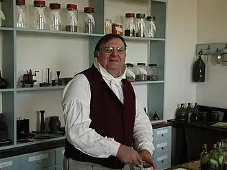 In the colonial and early independence years, necessity demanded a do-it-yourself approach to pharmacy. "Most, if not all, American medical men prepared and dispensed their own medications, since fee bills and custom usually provided fees for the medication and not the visit, unless surgery or delivery was involved."[16] Thus, oftentimes the doctor was the apothecary and the apothecary the doctor, especially among rural "country doctors" who predominated in this era of farmers with "freeholds" thinly dotting the colonies. "Even in the 1760s, when a younger and largely native born cohort of physicians returned from Europe, most of the reputable and even famous among the American medici ran their own pharmaceutical business,"[16] which, for most doctors for the bulk of the 18th century included mostly medications mixed and dispensed by hand, sometimes augmented with a supply of patent medicines imported from the UK or mainland Europe.[17]