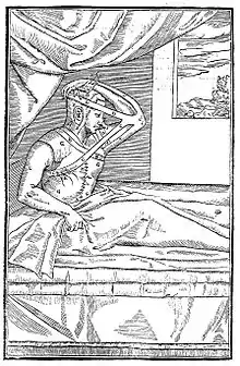 The Flemish artist Stradanus designed a print of a wealthy man receiving treatment for syphilis with the tropical wood guaiacum sometime around 1580.[58] The title of the work is "Preparation and Use of Guayaco for Treating Syphilis". That the artist chose to include this image in a series of works celebrating the New World indicates how important a treatment, however ineffective, for syphilis was to the European elite at that time. The richly colored and detailed work depicts four servants preparing the concoction while a physician looks on, hiding something behind his back while the hapless patient drinks.[59] Another artistic depiction of syphilis treatment is credited to Jacques Laniet in the seventeenth century as he illustrated a man using the fumigation stove, another popular method of syphilis treatment, with a nearby barrel etched with the saying "For a pleasure, a thousand pains."[57] Remedies to cure syphilis were frequently illustrated to deter those from acts which could lead to the contraction of syphilis because the treatment methods were normally painful and ineffective.