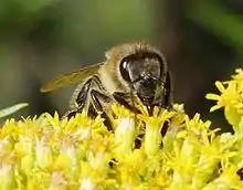 Leaving the hive, a foraging bee collects sugar-rich flower nectar, sucking it through its proboscis and placing it in its proventriculus (honey stomach or crop), which lies just dorsal to its food stomach. The honey stomach holds about 40 mg of nectar, or roughly 50% of the bee's unloaded weight, which can require over a thousand flowers and more than an hour to fill. The nectar generally begins with a water content of 70 to 80%.[15] Salivary enzymes and proteins from the bee's hypopharyngeal gland are added to the nectar to begin breaking down the sugars, raising the water content slightly. The forager bees then return to the hive, where they regurgitate and transfer nectar to the hive bees. The hive bees then use their honey stomachs to ingest and regurgitate the nectar, forming bubbles between their mandibles repeatedly until it is partially digested. The bubbles create a large surface area per volume and a portion of the water is removed through evaporation.[11][13][16][17] The bee's digestive enzymes hydrolyze converts sucrose to a mixture of glucose and fructose, and break down other starches and proteins, increasing the acidity.[11][13][18]