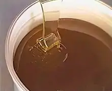 Unlike many other liquids, honey has very poor thermal conductivity of 0.5 W/(m⋅K) at 13% water content (compared to 401 W/(m⋅K) of copper), taking a long time to reach thermal equilibrium.[59] Due to its high kinematic viscosity honey does not transfer heat through momentum diffusion (convection) but rather through thermal diffusion (more like a solid), so melting crystallized honey can easily result in localized caramelization if the heat source is too hot or not evenly distributed. However, honey takes substantially longer to liquefy when just above the melting point than at elevated temperatures.[51] Melting 20 kg of crystallized honey at 40 °C (104 °F) can take up to 24 hours, while 50 kg may take twice as long. These times can be cut nearly in half by heating at 50 °C (122 °F); however, many of the minor substances in honey can be affected greatly by heating, changing the flavor, aroma, or other properties, so heating is usually done at the lowest temperature and for the shortest time possible.[60]