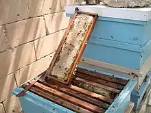The bees work together as a group with the regurgitation and digestion for as long as 20 minutes, passing the nectar from one bee to the next, until the product reaches the honeycombs in storage quality.[13] It is then placed in honeycomb cells and left unsealed while still high in water content (about 50 to 70%) and natural yeasts which, unchecked, would cause the sugars in the newly formed honey to ferment.[12][19][20] Bees are among the few insects that can generate large amounts of body heat, and the hive bees constantly regulate the hive temperature, either heating with their bodies or cooling with water evaporation, to maintain a fairly constant temperature of about 35 °C (95 °F) in the honey-storage areas. The process continues as hive bees flutter their wings constantly to circulate air and evaporate water from the honey to a content around 18%, raising the sugar concentration beyond the saturation point and preventing fermentation.[12][13] The bees then cap the cells with wax to seal them.[13] As removed from the hive by a beekeeper, honey has a long shelf life and will not ferment if properly sealed.[12]
