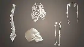 The human skeleton of an adult consists of around 207 to 213 bones, and there are 300 bones in children, depending on the counting of sternum (which may alternatively be included as the manubrium, body of sternum, and the xiphoid process).[1] It is composed of 300 bones at birth, but later decreases to 80 bones in the axial skeleton and 126 bones in the appendicular skeleton. Many small accessory bones, such as some sesamoid bones, are not included in this count. There are 20 major bones.