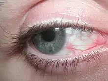 Eye irritation has been defined as "the magnitude of any stinging, scratching, burning, or other irritating sensation from the eye".[31] It is a common problem experienced by people of all ages. Related eye symptoms and signs of irritation are discomfort, dryness, excess tearing, itching, grating, foreign body sensation, ocular fatigue, pain, scratchiness, soreness, redness, swollen eyelids, and tiredness, etc. These eye symptoms are reported with intensities from mild to severe. It has been suggested that these eye symptoms are related to different causal mechanisms, and symptoms are related to the particular ocular anatomy involved.[32]