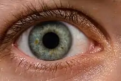 The approximate field of view of an individual human eye (measured from the fixation point, i.e., the point at which one's gaze is directed) varies by facial anatomy, but is typically 30° superior (up, limited by the brow), 45° nasal (limited by the nose), 70° inferior (down), and 100° temporal (towards the temple).[6][7][8] For both eyes combined (binocular) visual field is 135° vertical and 200° horizontal.[9][10] It is an area of 4.17 steradians or 13700 square degrees for binocular vision.[11] When viewed at large angles from the side, the iris and pupil may still be visible by the viewer, indicating the person has peripheral vision possible at that angle.[12][13][14]