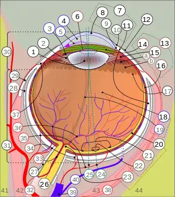 1. Lens, 2. Zonule of Zinn or Ciliary zonule, 3. Posterior chamber and 4. Anterior chamber with 5. Aqueous humour flow; 6. Pupil, 7. Corneosclera or Fibrous tunic with 8. Cornea, 9. Trabecular meshwork and Schlemm's canal. 10. Corneal limbus and 11. Sclera; 12. Conjunctiva, 13. Uvea with 14. Iris, 15. Ciliary body (with a: pars plicata and b: pars plana) and 16. Choroid); 17. Ora serrata, 18. Vitreous humor with 19. Hyaloid canal/(old artery), 20. Retina with 21. Macula or macula lutea, 22. Fovea and 23. Optic discblind spot; 24. Optical axis of the eye. 25. Axis of eye, 26. Optic nerve with 27. Dural sheath, 28. Tenon's capsule or bulbar sheath, 29. Tendon.