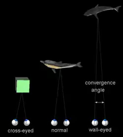When a creature with binocular vision looks at an object, the eyes must rotate around a vertical axis so that the projection of the image is in the centre of the retina in both eyes. To look at a nearby object, the eyes rotate 'towards each other' (convergence), while for an object farther away they rotate 'away from each other' (divergence).