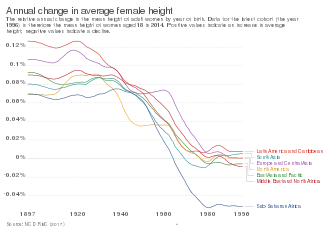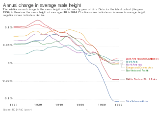 In general, there were no big differences in regional height levels throughout the nineteenth century.[65] The only exceptions of this rather uniform height distribution were people in the Anglo-Saxon settlement regions who were taller than the average and people from Southeast Asia with below-average heights. However, at the end of the nineteenth century and in the middle of the first globalisation period, heights between rich and poor countries began to diverge.[66] These differences did not disappear in the deglobalisation period of the two World wars. Baten and Blum (2014) [67] find that in the nineteenth century, important determinants of height were the local availability of cattle, meat and milk as well as the local disease environment. In the late-twentieth century, however, technologies and trade became more important, decreasing the impact of local availability of agricultural products.