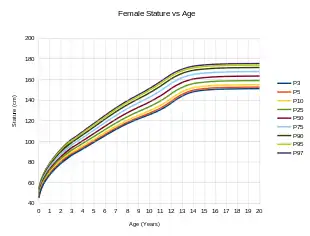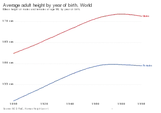 The study of height is known as auxology.[12] Growth has long been recognized as a measure of the health of individuals, hence part of the reasoning for the use of growth charts. For individuals, as indicators of health problems, growth trends are tracked for significant deviations and growth is also monitored for significant deficiency from genetic expectations. Genetics is a major factor in determining the height of individuals, though it is far less influential in regard to differences among populations. Average height is relevant to the measurement of the health and wellness (standard of living and quality of life) of populations.[13]