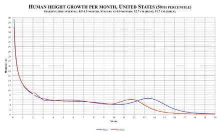Height measurements are by nature subject to statistical sampling errors even for a single individual. In a clinical situation, height measurements are seldom taken more often than once per office visit, which may mean sampling taking place a week to several months apart. The smooth 50th percentile male and female growth curves illustrated above are aggregate values from thousands of individuals sampled at ages from birth to age 20. In reality, a single individual's growth curve shows large upward and downward spikes, partly due to actual differences in growth velocity, and partly due to small measurement errors.