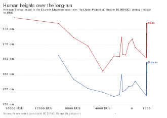 In the 150 years since the mid-nineteenth century, the average human height in industrialised countries has increased by up to 10 centimetres (3.9 in).[60] However, these increases appear to have largely levelled off.[60][61] Before the mid-nineteenth century, there were cycles in height, with periods of increase and decrease;[62] however, apart from the decline associated with the transition to agriculture, examinations of skeletons show no significant differences in height from the neolithic revolution through the early-1800s.[63][64]