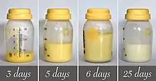 Human milk immune composition is known to change over the course of lactation.[12] Most notably, antibody levels are lower in mature milk than in colostrum,[7] with SIgA measuring at up to 12 grams per liter in colostrum and decreasing to 1 gram per liter in mature milk.[8] Studies find time postpartum to be most influential on the presence of immune factors, including growth factors[16] and lactoferrin.[11]