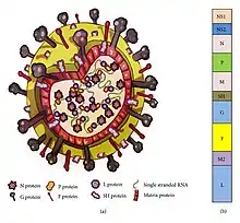 RSV is a medium-sized (~150 nm) enveloped virus. While most particles are spherical, filamentous species have also been identified.[2][9] The genome rests within a helical nucleocapsid and is surrounded by matrix protein and an envelope containing viral glycoproteins.[22] There are 11 proteins, described further in the table below.