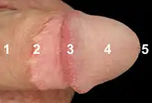 The enlarged and bulbous-shaped end of the corpus spongiosum forms the glans penis with two specific types of sinusoids, which supports the foreskin, or prepuce, a loose fold of skin that in adults can retract to expose the glans.[7] The area on the underside of the penis, where the foreskin is attached, is called the frenum, or frenulum. The rounded base of the glans is called the corona. The perineal raphe is the noticeable line along the underside of the penis.