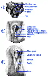 In the developing fetus, the genital tubercle develops into the glans of the penis in males and into the clitoral glans in females; they are homologous. The urogenital fold develops into the skin around the shaft of the penis and the urethra in males and into the labia minora in females.[1] The corpora cavernosa are homologous to the body of the clitoris; the corpus spongiosum is homologous to the vestibular bulbs beneath the labia minora; the scrotum, homologous to the labia majora; and the foreskin, homologous to the clitoral hood.[1][19] The raphe does not exist in females, because there, the two halves are not connected.