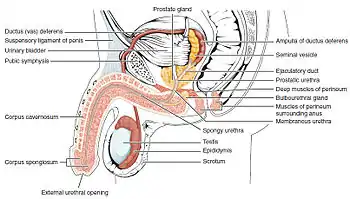 The urethra, which is the last part of the urinary tract, traverses the corpus spongiosum, and its opening, known as the meatus /miːˈeɪtəs/, lies on the tip of the glans penis. It is a passage both for urine and for the ejaculation of semen. Sperm are produced in the testes and stored in the attached epididymis. During ejaculation, sperm are propelled up the vas deferens, two ducts that pass over and behind the bladder. Fluids are added by the seminal vesicles and the vas deferens turns into the ejaculatory ducts, which join the urethra inside the prostate gland. The prostate as well as the bulbourethral glands add further secretions, and the semen is expelled through the penis.