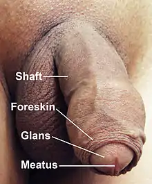 ![]() A flaccid penis, with surrounding pubic hair removed to show anatomical detail | |