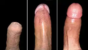 Most of the penis develops from the same embryonic tissue as does the clitoris in females. The skin around the penis and the urethra come from the same embryonic tissue from which develops the labia minora in females.[1][2] An erection is the stiffening and rising of the penis, which occurs during sexual arousal. Erections can also occur in non-sexual situations; spontaneous non-sexual erections frequently occur during adolescence and during sleep. In its flaccid (unerect) state, the shaft of the penis has the feel of a dense sponge encased in very smooth eyelid-type skin. The glans of the penis, in uncircumcised males, is covered by the foreskin. In its fully erect (hard) state, the shaft of the penis is rigid, with the skin tightly stretched. The glans of the erect penis has the feel of a raw mushroom. An erect penis may be straight or curved and may point at an upward angle, a downward angle, or straight ahead. As of 2015, the best research on penis size concluded that the average erect human penis is 13.12 cm (5.17 inches) long and has a circumference of 11.66 cm (4.59 inches).[3][4] Neither age nor size of the flaccid penis accurately predicts erectile length.
