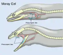 Pharyngeal jaws are a "second set" of jaws contained within the pharynx of many species of fish, distinct from the primary (oral) jaws. Pharyngeal jaws have been studied in moray eels where their specific action is noted. When the moray bites prey, it first bites normally with its oral jaws, capturing the prey. Immediately thereafter, the pharyngeal jaws are brought forward and bite down on the prey to grip it; they then retract, pulling the prey down the eel's esophagus, allowing it to be swallowed.[11]