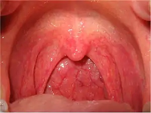 Pharyngitis is the painful swelling of the throat. The oropharynx shown here is very inflamed and red.