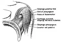 • the salpingopalatine fold, a smaller fold, in front of the salpingopharyngeal fold, extending from the superior part of the torus to the palate and containing the levator veli palatini muscle. It also contains some muscle fibres called salpingopalatine muscle[3] The tensor veli palatini is lateral to the levator and does not contribute to the fold, since the origin is deep to the cartilaginous opening.