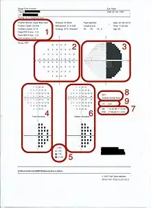 - Fixation losses: Recorded when a patient responds to a stimulus that is projected on to area of their blind spot. Fixation losses exceeding 20%, are denoted with an 'XX' next to the score, and deems results unreliable[12]