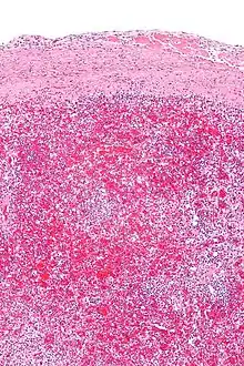 The spleen is commonly affected and often referred to as sugar-coated spleen.[3] The liver and heart are also sometimes affected and referred to as frosted liver (or sugar-coated liver) and frosted heart respectively.[1]