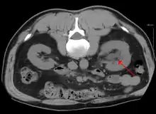 The signs and symptoms of hydronephrosis depend upon whether the obstruction is acute or chronic, partial or complete, unilateral or bilateral. Hydronephrosis that occurs acutely with sudden onset (as caused by a kidney stone) can cause intense pain in the flank area (between the hips and ribs) known as a renal colic. Historically, this type of pain has been described as "Dietl's crisis".[1] Conversely, hydronephrosis that develops gradually over time will generally cause either a dull discomfort or no pain. Nausea and vomiting may also occur. An obstruction that occurs at the urethra or bladder outlet can cause pain and pressure resulting from distension of the bladder. Blocking the flow of urine will commonly be prone to urinary tract infections which can lead to further development of stones, fever, and blood or pus in the urine. If complete obstruction occurs, a postrenal kidney failure (obstructive nephropathy) may follow.[2]