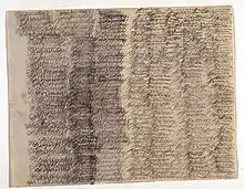 There are many accounts of patients writing in nonsensical patterns including writing in a center-seeking spiral starting around the edges of a piece of paper.[5] In one case study, a patient even wrote backwards, so that the writing could only be interpreted with the aid of a mirror.[2] Sometimes the writing can consist of scribbles and frantic, random thoughts that are quickly jotted down on paper very frequently. Grammar can be present, but the meaning of these thoughts is generally hard to grasp and the sentences are loose.[5] In some cases, patients write extremely detailed accounts of events that are occurring or descriptions of where they are.[5]