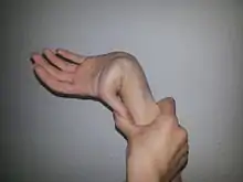 • Left thumb touching the forearm