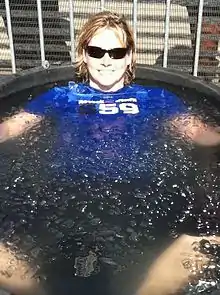 It has been used by athletes such as A. J. Soares[5] and Olympic swimmer Michael Phelps[32] as well as other celebrity endorsers[33] and is getting to become "common practice" among athletes[20][31][34] from different sports, including American football,[35] association football (soccer),[2][5] long distance running,[7][9][23] rugby,[1][28] tennis,[36] volleyball,[6] and other sports. There was a report that sports equipment manufacturers are considering different designs for ice baths.[37] In the summer of 2014, as a fundraising method, the nonprofit ALS Association, which raises money for research and public awareness of amyotrophic lateral sclerosis or ALS, also known as Lou Gehrig's disease, began the Ice Bucket Challenge which involved donors filming themselves and challenging other donors to participate and then being doused with a bucket of ice cold water; as a fundraising effort, it raised $16 million over a 22-day period.[38][39]