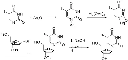 It is a nucleoside analogue, a modified form of deoxyuridine, similar enough to be incorporated into viral DNA replication, but the iodine atom added to the uracil component blocks base pairing. It is used only topically due to cardiotoxicity. It was synthesized by William Prusoff in the late 1950s.[1] Initially developed as an anticancer drug, idoxuridine became the first antiviral agent in 1962.[2]