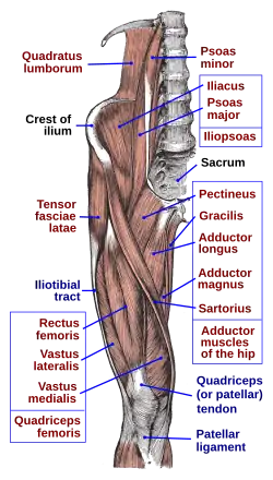 The psoas major unites with the iliacus at the level of the inguinal ligament. It crosses the hip joint to insert on the lesser trochanter of the femur.[1] The iliopsoas is classified as an "anterior hip muscle" or "inner hip muscle".[2] The psoas minor does contribute to the iliopsoas muscle.