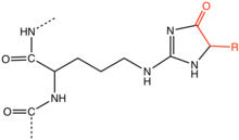 4-imidazolones are advanced glycation endproducts (AGEs), a class of modified proteins that are biomarkers for diabetes. In this drawing the imidazolone is the C3N2 ring in red and black.[1]