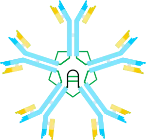 Immunoglobulin M (IgM) is one of several isotypes of antibody (also known as immunoglobulin) that are produced by vertebrates. IgM is the largest antibody, and it is the first antibody to appear in the response to initial exposure to an antigen.[1][2] In the case of humans and other mammals that have been studied, the spleen, where plasmablasts responsible for antibody production reside, is the major site of specific IgM production.[3][4]