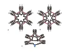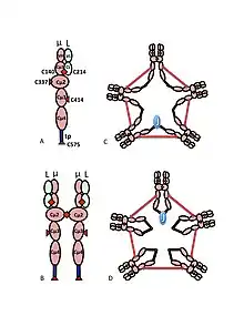 On the basis of its sedimentation velocity and appearance in electron micrographs, it was inferred that IgM is mostly a “pentamer”, i.e., a polymer composed of five “monomers” [(µL)2]5, and was originally depicted by the models in Figures 1C and 1D, with disulfide bonds between the Cµ3 domains and between the tail pieces.[11][12] Also shown is that pentameric IgM includes a third protein, the J chain. J chain (J for joining) was discovered as a covalently bonded component of polymeric IgA and IgM.[13][14] J chain is a small (~137 amino acids), acidic protein. As shown, J chain joins two µ chains via disulfide bonds involving cysteines in the tailpieces.[15]