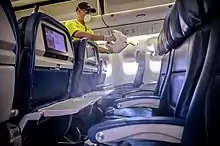 Although a HEPA filter captures 99.97 percent of airborne particles, it does not account for air that does not go through the filter and many airlines have required passengers to wear masks during the flight.[138] According to the U.S. Centers for Disease Control and Prevention, pathogens do not spread easily on flights, but prolonged proximity still presents a danger of infection.[139]