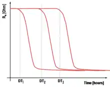 In Fig. 2 a typical curve for Rs as well as the corresponding bacterial concentration are plotted vs. time. Fig. 3 shows typical Rs curves vs time for samples characterized by different bacterial concentration. Since DT is the time needed for the bacterial concentration to grow from the initial value C0 to CTH, highly contaminated samples are characterized by lower values of DT than samples with low bacterial concentration. Given C1, C2 and C3 the bacterial concentration of three samples with C1 > C2 > C3, it is DT1 < DT2 < DT3. Data from literature show how DT is a linear function of the logarithm of C0:[10][11]
