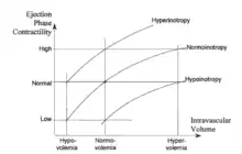 The preload and the Frank-Starling (mechanically)-induced level of contractility is modulated by variation of intravascular volume (volume expansion or volume reduction/diuresis).
