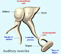 Incudostapedial joint or articulatio incudostapedia is a small synovial joint between the incus (anvil) and the stapes (stirrup). Synovial joints are of different types depending upon the anatomy of the joint and the movement it allows. Thus, accordingly the incudostapedial joint is a ball and socket type of synovial joint. Incudomalleolar joint is gliding type of synovial joint. The joint's function is to transfer vibrations between the ossicles in the middle ear, which is perceived as sound. The ossicular systems helps in matching the impedance the sound waves suffer, hence maintaining the intensity. Contrary to other synovial joints the moment is very limited and is usually only of springy character. All of the ossicles move as a unit.