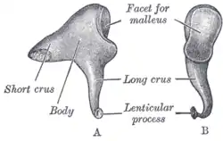 The incus is the second of the ossicles, three bones in the middle ear which act to transmit sound. It is shaped like an anvil, and has a long and short crus extending from the body, which articulates with the malleus.[2]:862 The short crus attaches to the posterior ligament of the incus. The long crus articulates with the stirrup at the lenticular process.