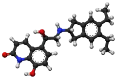 Indacaterol is an ultra-long-acting beta-adrenoceptor agonist[4] developed by Novartis. It needs to be taken only once a day,[5] unlike the related drugs formoterol and salmeterol. It is licensed only for the treatment of chronic obstructive pulmonary disease (COPD) (long-term data in patients with asthma are thus far lacking). It is delivered as an aerosol formulation through a dry powder inhaler.