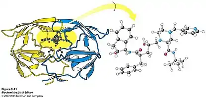 The drug fits inside the protease, stopping it from functioning normally. As a result, structural proteins, resulting from polypeptide products of gag and gag-pol genes, that are necessary for the HIV virions cannot form. Eventually, the viral load decreases because of the lack of reproduction.[1]