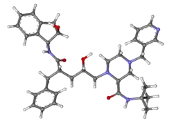 Indinavir (IDV; trade name Crixivan, made by Merck) is a protease inhibitor used as a component of highly active antiretroviral therapy to treat HIV/AIDS. It is soluble white powder administered orally in combination with other antiviral drugs. The drug prevents protease from functioning normally. Consequently, HIV viruses cannot reproduce, causing a decrease in the viral load. Commercially sold indinavir is indinavir anhydrous, which is indinavir with an additional amine in the hydroxyethylene backbone. This enhances its solubility and oral bioavailability, making it easier for users to intake. It was synthetically produced for the purpose of inhibiting the protease in the HIV virus.[1]