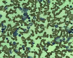 Small cell lymphocytic lymphoma (SLL)/chronic lymphocytic leukemia (CLL) are the same disease differing in its manifestations and are managed in the same way.[22] When the abnormal lymphocytes are located mostly in the lymph nodes, it is referred to as SLL, when the abnormal lymphocytes are mostly located in the blood and bone marrow, it is called CLL.[23] CLL is the commonest leukemia in the western countries, but it is very rare East Asia, including Japan.[24]The median age at diagnosis is 72 years.[22]