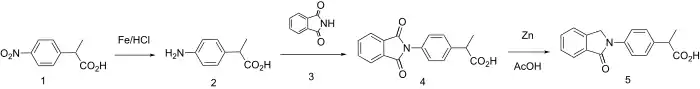 Reduction of the nitro group in arylpropionic acid (1) gives the corresponding aniline (2). Reaction of the intermediate with the imide (3) from phthalic anhydride (i.e. phthalimide) gives the product (4) in which the aniline nitrogen has exchanged with ammonia (apparently phthalic anhydride was not used directly). Treatment of the new imide with zinc in acetic acid leads to reduction of but one of the carbonyl groups to afford indolone, indoprofen.