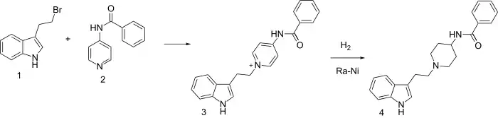 One such study involved alkylation of 4-benzamidopyridine (2) with 3-(2-Bromoethyl)-1H-indole (1) to give quaternary salt (3); this intermediate was in turn hydrogenated with a Raney nickel catalyst to give indoramine (4).