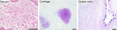 - Teratoma formation: iPSCs injected into immunodeficient mice spontaneously formed teratomas after nine weeks. Teratomas are tumors of multiple lineages containing tissue derived from the three germ layers endoderm, mesoderm and ectoderm; this is unlike other tumors, which typically are of only one cell type. Teratoma formation is a landmark test for pluripotency.