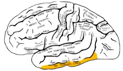 ![]() Lateral surface of left cerebral hemisphere, viewed from the side. (Inferior temporal gyrus shown in orange.) | |